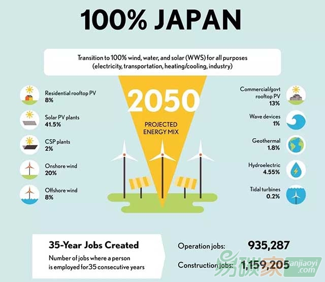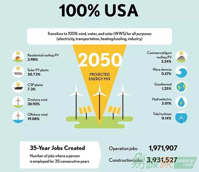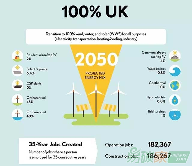 住宅屋頂光伏8%;太陽能光伏41.5%;集中式太陽能2%;陸上風電:20%;海上風電8%;商業/政府用房屋頂光伏13%;浪潮設備1%;地熱1.8%;水電4.55%;潮汐渦輪0.2%