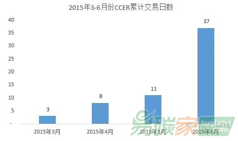 ccer的成交頻率是評價(jià)交易活躍程度的重要指標(biāo),截止6月底試點(diǎn)碳市場有成交記錄的月份為3-6月。根據(jù)對試點(diǎn)碳市場發(fā)布的交易信息的統(tǒng)計(jì)(不完全統(tǒng)計(jì)),履約期期間,即6月份是交易活躍程度最高的月份,6月份試點(diǎn)碳市場累計(jì)有37個(gè)交易日出現(xiàn)CCER交易,而3-5月份累計(jì)僅22個(gè)交易日有CCER交易。