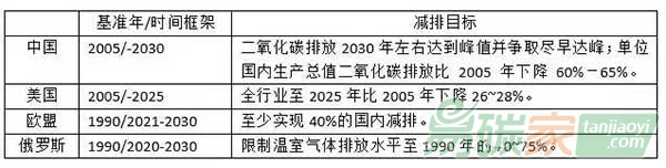 目前已經(jīng)有17個(gè)INDCs提交到UNFCCC,代表了45個(gè)締約方。主要的溫室氣體排放國(guó)都已經(jīng)提交,包括了中國(guó)、美國(guó)、歐盟、俄羅斯,如下表所示。從各國(guó)提交的減排目標(biāo)可以看出,歐盟仍保持著應(yīng)對(duì)氣候變化先鋒的角色,提出的目標(biāo)也與IPCC評(píng)估報(bào)告中指出的減排水平一致。而美國(guó)也提出了較為大膽的目標(biāo),但是由于基準(zhǔn)年不同,不便做直接的比較。
