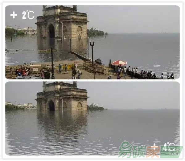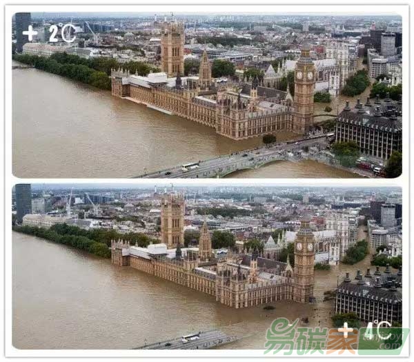 據美國媒體報道,美國氣候專家日前提供的一份報告顯示,如果全球氣候變暖導致氣溫升高2攝氏度,將造成2.8億人居住的大片陸地被淹沒;而如果平均氣溫升高4攝氏度,則會造成7.6億人因家園被水淹沒而無家可歸。這份報告還隨附了當平均氣溫升高2攝氏度和4攝氏度時,全球幾大著名城市的景象。這些預測照片時時刻刻在告訴人們,2度和4度絕不是簡單的小小數字,而是有可能使我們賴以生存的生態環境和家園發生翻天覆變化的巨大力量。