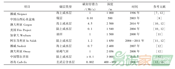 然而,陸地碳封存具有較高的泄漏風險,并極易進入地下水和土壤,破壞生態(tài)平衡。雖然海洋碳封存與陸地碳封存相比其技術(shù)還不成熟,但其碳封存潛力巨大,且可消除其他碳封存方法易引起的多種擔憂,具有明顯的優(yōu)勢。表1列出了多個國家在不同類型儲層已實施或正在實施的10個國際碳封存項目。本文將重點闡述海洋碳封存技術(shù)的研究現(xiàn)狀和存在問題,并對該領域的發(fā)展前景進行展望。