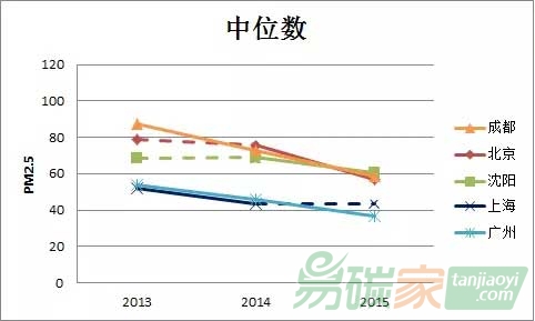 北京都是五個城市中空氣質量最差的城市,沈陽、成都的污染嚴重程度相似,分別位列第二和第三。廣州和上海最好,上海的年度均值主要在50-60微克/立方米的范圍,廣州在40-50微克/立方米之間;從中位數濃度上來看,成都的空氣質量最差,在60-90微克/立方米之間,緊隨其后的是北京和沈陽,上海和廣州的中位數濃度最低,基本處于40-55微克/立方米的范圍。