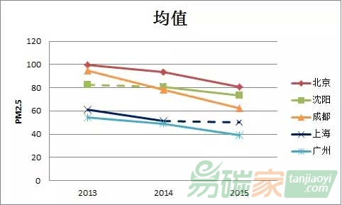 5、從2014年開始,五大城市的三個主要濃度指標(均值、中位數、90%分位數)均有所降低。具體而言,五個城市的污染在2013年都是最嚴重的。與2013年相比,2014年的污染程度有所改善,2015年又有進一步的改善。但各城市的改善程度并不盡相同。在五個城市中,除上海之外,最明顯的改善均出現在2015年。
