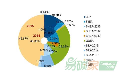 對比7個碳交易試點兩個年度的各自交易情況,如圖3-2,可以發現變化最大的是廣東碳市場。2015年度廣東碳市場交易總量占全國總交易量的27%,而在2014年度該值僅為6%,份額的來源