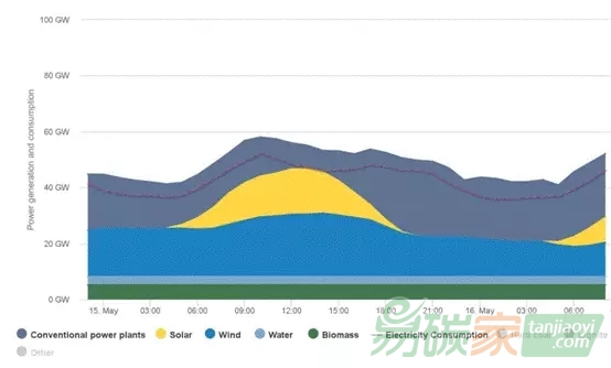 據(jù)了解,2016年5月15日當?shù)貢r間下午2點,據(jù)柏林的Agora電力研究機構(gòu)監(jiān)測,太陽能及風能達到峰值,可再生能源供應(yīng)電力達到45.5GW,與此同時整體電力需求為45.8GW。與此同時,電力價格在一些15分鐘的周期內(nèi)出現(xiàn)了一定的回落,最低跌至50歐元(57美元)/MWh。