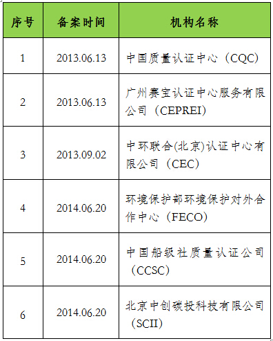 國家發展改革委已在2013年6月份、9月份分別對中國質量認證中心、廣州賽寶認證中心服務有限公司、中環聯合(北京)認證中心有限公司等3家機構予以溫室氣體交易審定與核證機構的備案。至此,國內具備溫室氣體自愿減排交易審定與核證資質的機構已達6家,具體信息如下表所示。