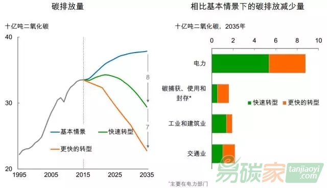 而在更快的轉(zhuǎn)型情景下,到2035年,碳排放量將比2015年低32%。這與國(guó)際能源署450情景中的碳排放下降幅度一致。