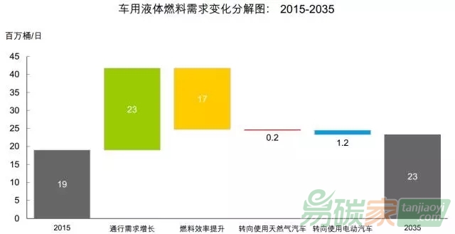 而總的來(lái)說(shuō),新興經(jīng)濟(jì)體中對(duì)汽車需求的增加,超過(guò)了提高燃油效率和交通電氣化對(duì)汽車液體燃料需求的減少效果,使得車用液體燃料需求增加了400萬(wàn)桶/日,約占展望期間全球新增需求的四分之一。
