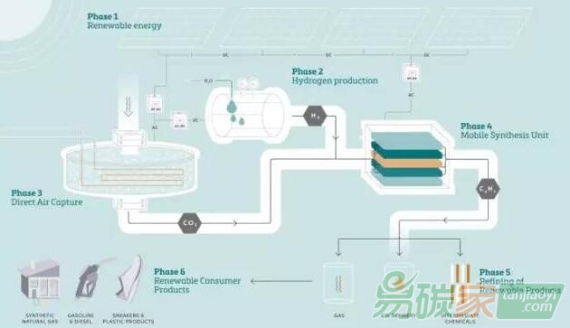 演示工廠包括四個獨立的單元:一個太陽能發電廠 ; 從空氣中分離二氧化碳和水的設備; 使用電解產生氫的部分; 以及用于從二氧化碳和氫氣生產原油替代物的合成設備。