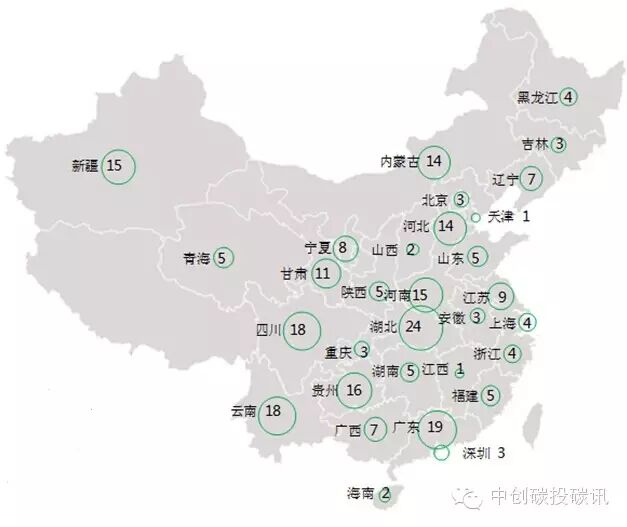 從項目地域分布來看,提交備案申請CCER項目數(shù)量居前列是湖北、廣東、云南、貴州、四川、新疆、河南等省份。“兩省五市”碳排放權(quán)交易試點中,湖北省提交備案申請項目24個,廣東省提交備案申請項目19個(含深圳市3個);其他城市提交備案申請項目的數(shù)量為,上海市4個、北京市3個,重慶市3個,深圳市3個,天津市1個。在信息平臺公示的審定項目按區(qū)域分布如圖2所示。