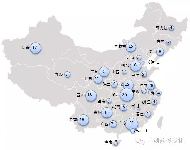 從項目地域分布來看,提交備案申請CCER項目數量居前列是湖北、廣東、云南、四川、新疆、河北、貴州等省份。“兩省五市”碳排放權交易試點中,湖北省提交備案申請項目26個,廣東省提交備案申請項目23個(含深圳市3個);其他城市提交備案申請項目的數量為,上海市4個、北京市3個,重慶市3個,深圳市3個,天津市1個。在信息平臺公示的審定項目按區域分布如圖2所示。