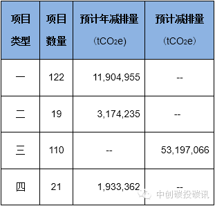 根據審定項目的公示PDD,按照申請備案的項目類型區分,《溫室氣體減排交易管理暫行辦法》中規定的第三類備案項目(獲得國家發改委批準為CDM項目且在聯合國CDM執行理事會注冊前產生減排量的項目,pre-CDM項目)達到110個,在補充計入期內預計產生減排量合計約為5320萬tCO2e;第一類項目(經國家發改委備案的方法學開發的自愿減排項目)122個,預計年減排量合計約為1190萬tCO2e;第二類項目(獲得國家發改委批準為CDM項目但未在聯合國CDM執行理事會注冊的項目)19個,預計年減排量合計約為317萬tCO2e;第四類備案項目(在聯合國CDM EB注冊但減排量未獲得簽發的項目)21個,預計年減排量合計約為193萬tCO2e。在信息平臺公示以上4類項目的備案申請數量及產生的減排量如表1所示。