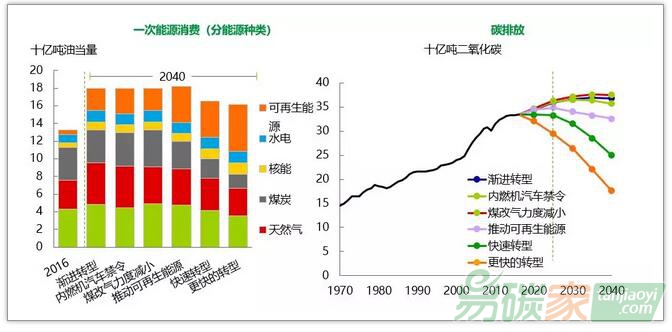 為了將全球溫度上升限制在2℃以下,更快的轉型情景下的碳排放量與國際能源署的可持續發展情景類似,此外,BP還研究了“禁止銷售內燃機汽車”,“加大對可再生能源的政策推動”以及“降低對煤改氣的政策支持力度”等情景。