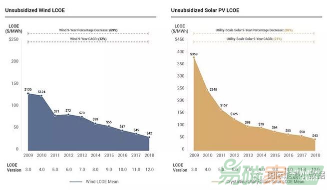 從平準化成本變化趨勢來看,2009年到2018年陸上風電LCOE下降69%,9年來年平均下降12%;大型地面光伏LCOE下降88%,9年來年平均下降21%。