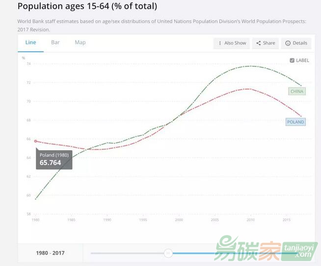 圖:15-64歲人口占總人口比例,%:中國和波蘭