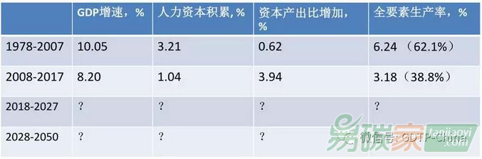 表里列舉的是清華大學經管學院白重恩老師的數據,他把1978-2007年以及最近十年的GDP增速分解成人力資本積累,資本產出比增加和全要素生產率貢獻,這是增長經濟學的基本分析。