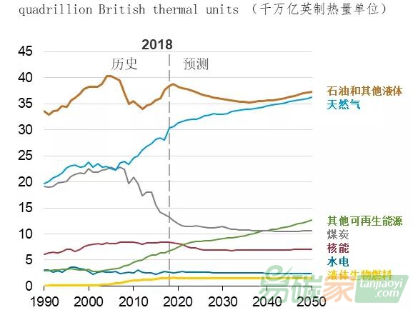 圖1: 美國能源消費構成 (2018年之后為基本情景預測)