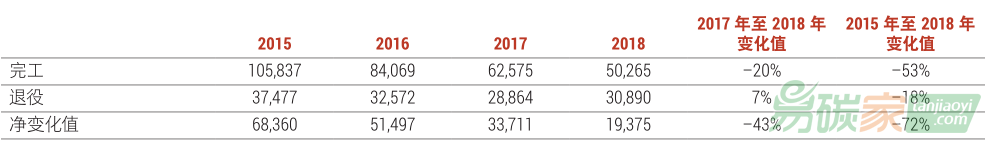表3:年度完工和退役的煤電機(jī)組裝機(jī),2015年至2018年,以及年凈變化值(兆瓦)