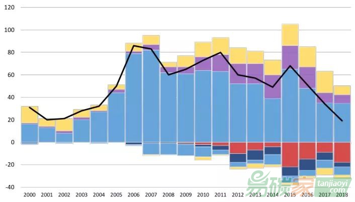 圖3:2000年至2018年新增煤電裝機(jī)(0GW以上)、退役裝機(jī)(0GW以下)(彩色)和全球凈變化值(黑線)。