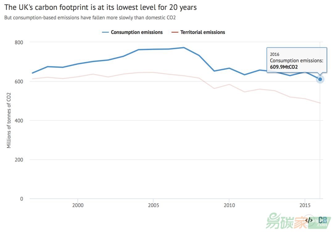 碳足跡進行了估算。最新數(shù)據(jù)顯示,英國2016年的以消費為基礎的碳足跡達到20年來的最低水平,比1997年的排放量低約10%。