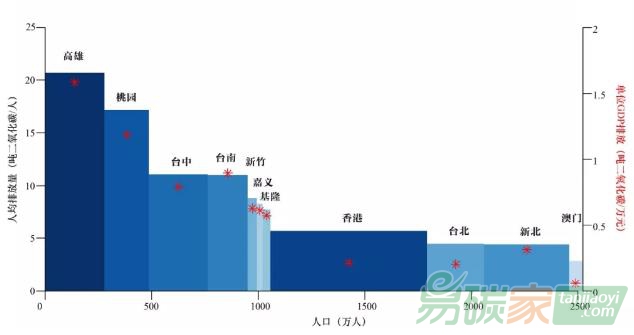 碳排放,柱形寬度代表人口;柱形顏色越深,代表城市排放總量越高;紅色“*”形(右Y軸)代表單位GDP二氧化碳排放。