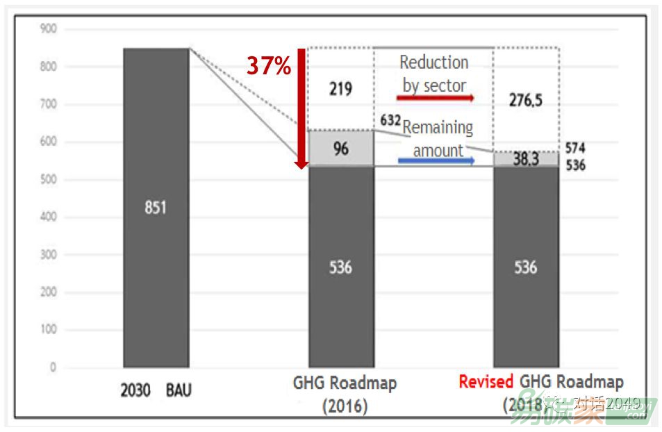 2015年,韓國(guó)確定了國(guó)家自主貢獻(xiàn)(INDC),要在2030年實(shí)現(xiàn)溫室氣體排放量和常規(guī)情景(business-as-usual)相比降低37%。我們?cè)?016年制定了溫室氣體減排路線圖,并在2018年修訂了個(gè)別行業(yè)部門的目標(biāo),比如國(guó)內(nèi)從25.7%調(diào)整到32.5%。