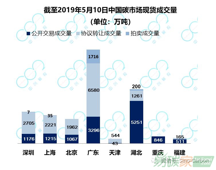 截至2019年5月10日,8個區(qū)域碳市場一、二級現(xiàn)貨市場累計成交3.08億噸,總成交額67.28億元。廣東、湖北成交量最高,位于第一梯隊;深圳、上海、北京位于第二梯隊;而天津、重慶、福建的成交量相對較低,位于第三梯隊。