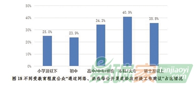 圖18 不同受教育程度公眾“通過網(wǎng)絡(luò)、熱線等公開渠道給政府提工作建議”占比情況