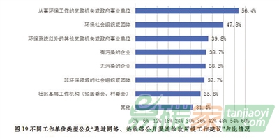 不同工作單位類型的受訪者之間也存在較大差異。其中,“從事環(huán)保工作的黨政機(jī)關(guān)或政府事業(yè)單位”的受訪者和環(huán)保社會(huì)組織從業(yè)者“通過網(wǎng)絡(luò)、熱線等公開渠道給政府提工作建議”的比例最高,分別為56.4%和47.8%;社區(qū)基層工作機(jī)構(gòu)(如居委會(huì)、村委會(huì))比例相對(duì)較低,為35.6%。