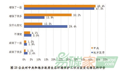 圖23 公眾對(duì)中央和地方政府生態(tài)環(huán)境保護(hù)工作力度變化情況的評(píng)價(jià)
