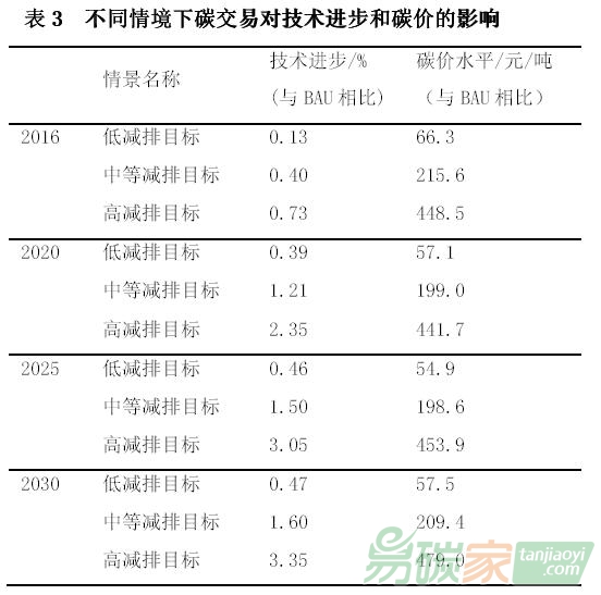 政策,政策力度的效果也就逐漸弱化。但是在高減排目標(biāo)約束下,企業(yè)的減排任務(wù)相對(duì)較重,減排努力也較大,因此技術(shù)進(jìn)步持續(xù)的時(shí)間也較長(zhǎng)。與此同時(shí),表3 中顯示三種減排目標(biāo)下,碳價(jià)都維持在相對(duì)穩(wěn)定的水平,并未出現(xiàn)大幅度波動(dòng),這主要是由我國(guó)所處的發(fā)展階段所決定。我國(guó)經(jīng)濟(jì)發(fā)展在未來(lái)較長(zhǎng)的一段時(shí)間內(nèi)還將依賴于能源投入,高碳化的發(fā)展模式還無(wú)法扭轉(zhuǎn),這也就決定了碳交易市場(chǎng)是廣闊和巨大的。