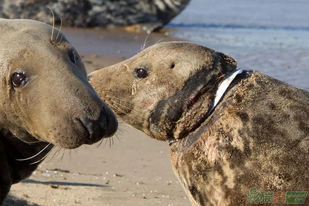 被人造塑料垃圾困住的野生海豹▽