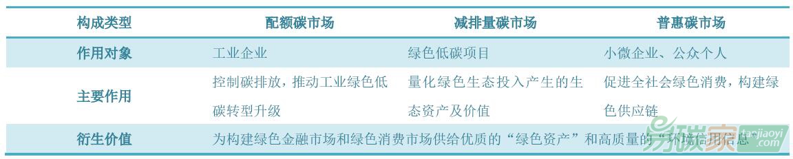 碳市場和普惠碳市場三者互相聯通、互為補充,形成了“三位一體”的多層次復合型碳市場格局。其中,配額碳市場通過