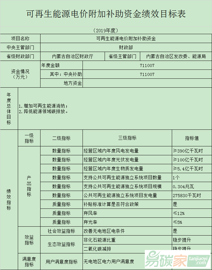 根據《財政部關于下達可再生能源電價附加補助資金預算的通知》(財建〔2019〕275號),現將2019年度中央可再生能源電價附加補助資金711007萬元下達給你們。其中:風力發電補助資金413794萬元,此款列2019政府收支分類科目“2116001風力發電補助”;光伏發電項目中自然人分布式光伏發電補助資金294萬元,光伏電站及工商業分布式光伏發電補助資金285615萬元,公共可再生能源獨立系統補助資金855萬元,此款列2019政府收支分類科目“2116002太陽能發電補助”;生物質能發電補助資金10449萬元,此款列2019政府收支分類科目“2116003生物質能發電補助”。結合財政部相關要求,并將有關事項通知如下: