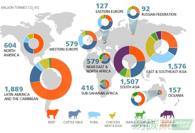 ?其次是豬肉(占排放量的9%),水牛奶和肉(8%),雞肉和雞蛋(8%),小型反芻動物奶和肉類(6%)。