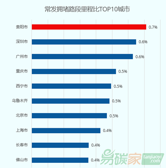 貴陽(yáng)常發(fā)擁堵路段比例最高另外,在常發(fā)擁堵路段里程比指標(biāo)評(píng)價(jià)中,貴陽(yáng)最高,其常發(fā)擁堵路段占比最高為0.7%,其次是深圳、廣州。從各城市最易常發(fā)擁堵路段的特點(diǎn)來(lái)看,常發(fā)擁堵多數(shù)道路都是因?yàn)榈缆妨髁窟^(guò)大與道路實(shí)際承載能力不能滿(mǎn)足有關(guān)。