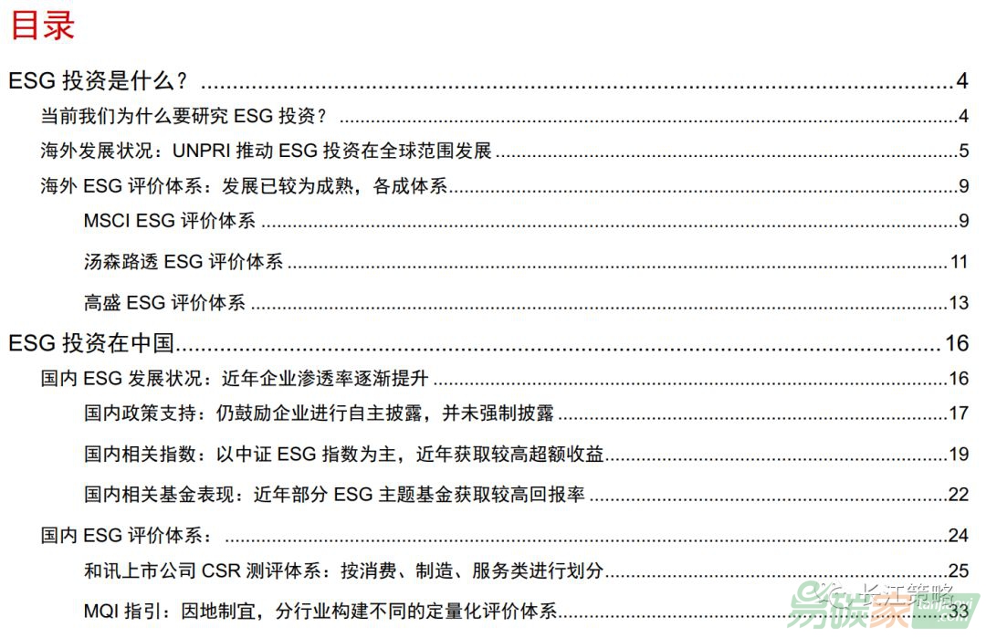 海外ESG評價體系:發展已較為成熟,各成體系目前海外主流的ESG評價體系主要有:MSCI ESG評價方法及湯森路透 ESG評價體系,此外高盛“GO SUSTAIN”投資策略也納入了對公司的ESG評價。作為長江可持續發展系列報告的第一篇,本次我們首先對海外主要ESG評價體系進行簡要介紹。