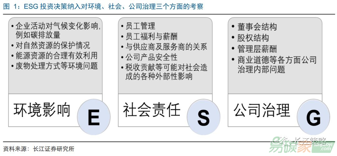 ESG投資考察環境影響、社會責任、公司治理三個方面。ESG(Environment、Social Responsibility、Corporate Governance)即環境、社會和公司治理三個英文單詞的首字母縮寫,包括企業對環境的影響、對于社會的責任以及企業內部的公司治理情況三個方面內容。而將環境影響、社會責任、公司治理三個因素納入到投資決策中的ESG投資,即是一種期望在長期中帶來更高投資回報率的新興投資策略。目前投資者對于上市公司的傳統評價方式,主要還是考慮該公司的基本面情況,包括近年盈利能力、財務狀況(其中又包括收入情況、成本費用情況、現金流狀況、償債能力等等)、估值水平以及所在行業的景氣度及公司未來發展空間等等。而ESG(環境、社會和公司治理,下同)投資策略還將企業的ESG表現納入到投資評估決策中,對公司治理、環境影響、社會責任等三項非財務指標類因素進行考核。例如,在環境方面,需要評估企業活動對氣候變化的影響、對自然資源的保護情況、能源是否得到合理有效的利用以及對廢物的處理方式等內容;在社會責任方面,需要評估企業對于公司自身員工的管理、給予員工的福利與薪酬,以及與上下游如供應商及服務商的關系,公司產品的安全性問題及稅收貢獻等可能對社會造成的各種外部性影響;在公司治理方面,則需要評估包括董事會結構、股權結構、管理層薪酬及商業道德等各方面問題。