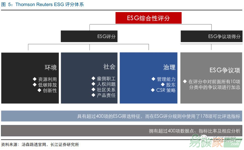 碳足跡監測和報告以滿足監管要求;10)綠色債券;11)包括ESG、多樣性和包容性等的相關指數。從數據范圍來看,湯森路透評分體系為了公平且客觀地衡量全球范圍內各家公司的相對ESG表現及承諾的有效性,根據公開資料及數據對公司進行10項大類指標評測,并按照權重對各項評測結果加權得到ESG評分,其中包括環境類的資源利用、低碳排放、創新性等三項,社會類的雇傭職工、人權問題、社區關系、產品責任等四項,以及公司治理類的管理能力、股東及CSR策略三項。此外,值得注意的是,湯森路透ESG綜合性評分體系不僅包括對公司環境保護、社會影響、內部治理等傳統三項10個類別的ESG評分,還囊括了對于公司爭議項的評分,這兩項相加最終構成了湯森路透ESG綜合性評分。這也是湯森路透ESG綜合評價體系與其他體系的主要區別,即將爭議項評分單獨納入到對公司ESG表現的綜合考察之中。那么湯森路透爭議項評價具體包括哪些內容?ESG爭議項包括對于企業社區關系、人權、管理、產品責任、資源利用、股東、勞動力等7個方面23項指標的評價綜合,主要根據近期媒體公開資料及報道內容中涉及到的各項指標對公司爭議項進行打分,且除了管理一項外,其他所有項目的指標打分都是定量化的。此外,值得注意的是,如果是近期發生的爭議項,即使最近一期的會計期間已經完結,也需要計入最近一期的爭議項分數中。例如如果該項爭議事件發生在2016年或者2017年,但公司最近的一個完整會計年度是2015年,則2016年或2017年已發生的爭議項事件均需要體現在2015年的爭議項評分中。這體現了公司如果近期有任何具有爭議性的負面消息,無論是否已超過會計原則中的最終計算時間窗口,都需要在最近一期的評分中得到反映,這充分體現了該評價體系的嚴謹性。另外,值得注意的是,湯森路透ESG綜合評分并不僅僅是ESG評分和爭議項評分兩項的簡單相加。當ESG爭議項評分大于50分時,ESG綜合評分將直接等于ESG評分;當ESG爭議項評分小于50分且大于ESG評分時,ESG綜合評分仍等于ESG評分;只有當ESG爭議項評分小于50分且小于ESG評分時,ESG綜合評分才等于兩項的等權平均值。這樣可以確保ESG爭議項評分被計算在內,且得到更為充分的考量與體現。