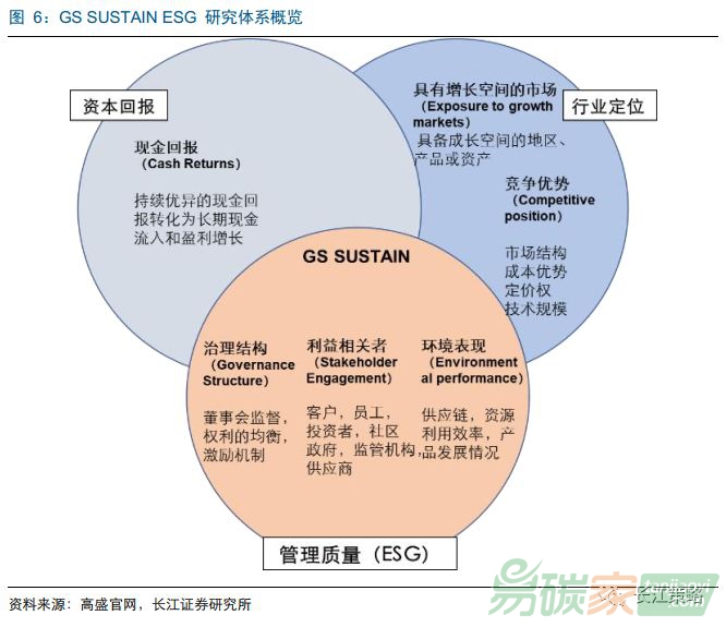 高盛ESG評價體系 高盛在其“買入并持有”(GS SUSTAIN)投資策略中,除了考慮企業所在行業定位、資本回報率等內容外,還納入了對企業管理質量(Mangement Quality)即ESG的分析。其中ESG分析主要包括公司治理結構、與利益相關者的參與行為、環境表現等三個部分,其中治理結構主要考察董事會監督、權力制衡、激勵機制等幾個方面,利益相關者主要考察與下游客戶、上游供應商及投資者關系、員工福利、社區政府及監管機構等方面內容,環境表現則主要考察供應鏈、資源利用效率及產品發展等方面內容。