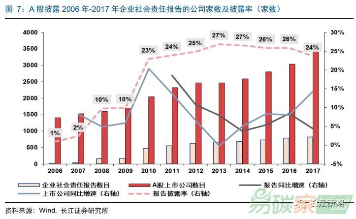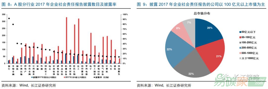 鋼鐵、交運、地產次之。從2017年的ESG報告披露率來看,銀行及非銀板塊披露率最高分別達到92%、80%,明顯高于其他申萬一級行業,如披露率僅次之的鋼鐵、交運、地產行業,披露率分別為41%、40%、37%。而從市值分布來看,則以100億元以上的大中型市值公司披露2017年企業社會責任報告為主,截至2018年5月31日,該市值類型公司家數占比達到59%,接近五分之三。整體來看,近年A股公司披露企業社會責任報告的自主性越來越強,對于披露社會責任報告的意識也越發深入,但從當前的行業及市值分布來看,仍然以金融、鋼鐵、交運、地產等行業且市值偏中型以上的公司披露率較高。我們認為,本身國企公司占比較高的行業以及市值規模偏大型的公司可能會有更高的傾向進行社會責任報告的披露。