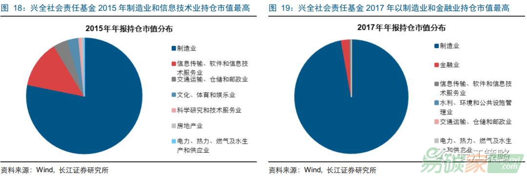 行情中,以及2017年的白馬股行情中,部分與企業社會責任相關主題概念的基金均獲取顯著較高的回報收益。觀察目前基金規模較大且自成立以來回報率顯著較高的基金如興全社會責任基金持倉風格情況,發現該只基金在2015年上半年及2017年全年獲取較高超額收益,從持倉市值分布來看,2015年以制造業和信息技術行業為主,持倉市值占比分別達到78.17%、13.18%,2017年則以制造業和金融業為主,持倉市值占比分別達到97.18%、2.38%,而