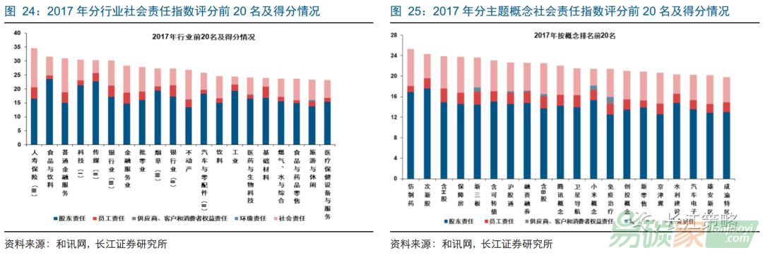 從近年的評分結果來看,該評測體系主要從三個維度來對全部A股上市公司進行打分,分別是各地區及省份、主題概念以及分行業。首先,分行業來看,2017年評分最高的十個行業分別為是人壽保險、食品與飲料、普通金融服務、科技、傳媒和銀行業(包括二級和三級行業)、金融服務業、批零業和煙草業。其中,人壽保險行業包括4家傳統險企A股上市公司,2017年社會責任一項評分較高,明顯高出2017年社會責任總分排名前20的其他行業,主要由于人壽保險行業所得稅占利潤總額比普遍高于其他行業。且人壽保險行業在近八年即2010-2017年間的平均分排名中位列第二位,說明近年整體仍保持較高的社會責任評分穩定性。但值得注意的是,2017年人壽保險行業總評分較2016年仍有所下滑,主要受到供應商、客戶、消費者責任項及分紅融資比指標分數明顯下降影響。另外,2017年食品與飲料行業評分提升較快,主要得益于2017年股東責任類指標中的回報項評分提升較高,其中分紅融資比、股息率及分紅占可分配利潤比重三項指標得分分別提升2.0分、1.87分、3.0分,導致該年行業得分提升幅度較大,且進一步觀察可發現,造成這種年度較大波動的原因是,該行業觀察標的僅廣州酒家(603043.SH)一家,而該公司在申萬二級行業食品加工中按照2018年5月29日總市值排名為第12位,總市值96.07億元,因此實際上并不具有對于全行業的代表性意義。為避免這種短期波動,我們對2010-2017年整體評分排名在前列的行業進行觀察,發現仍以金融、不動產、電力及食品飲料等與民生消費息息相關的行業為主,而工業制造類行業排名整體靠后。其次,分主題概念來看,2017年主題概念得分排名較高的有仿制藥、次新股、含H股、保障房、新三板等。進一步地,我們對2010~2017年間各主題概念排名前十名的次數進行統計,可以看出含H股及可轉債的概念表現最為亮眼,在過去的八年間有七年均排名在前十位,而海峽西岸、保障房、稀缺資源、滬股通、融資融券類主題也分別表現較佳。因此,整體來看,我們認為符合國家政策方向的主題概念在社會責任評分上往往具有較好表現,其次,由于股東責任一項評分占比較高,因此盈利和回報指標得分較高的主題往往具有更大優勢,例如仿制藥和次新股主題,2017年股東責任項得分分別達到16.95分、17.62分,明顯高于同期排名前20名的其他主題概念類得分。最后,分地區及省份來看,按照2017年得分表現排名,