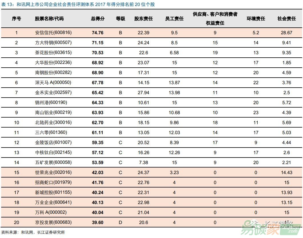 從個股層面來看,參考2017年該項社會責任評測體系得分前20位排名,整體以藍籌股為主,涉及板塊主要包括金融、地產、鋼鐵及消費類行業。其中安信信托總分最高,主要得益于較高的社會責任評分,2017年該項評分達到28.67分,遠遠高于排名前20的其他個股,而該項得分僅次于安信信托的為六家地產企業,包括招商蛇口、萬科A和京投發展,2017年該項得分均為15分,以及世榮兆業、新城控股、萬業企業,該項得分也均達到13分以上。由此可見,這項評價體系對于社會責任指標的較高權重主要利好所得稅占凈利潤比重較高的地產及金融行業,而這一板塊在A股總市值中占比也相應較高。