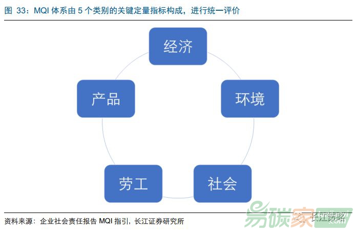 分行業來看,我們主要觀察屬于通常意義上的周期類重污染行業如煤炭、屬于公用事業類行業如電力以及屬于非實體經濟類行業如金融行業的定量指標考察體系所具有的特征。經過觀察發現,如煤炭這種對環境可能造成一定污染的工業企業行業,在MQI指引中設定的關鍵定量指標以環境為主,例如煤炭行業的20個關鍵指標中包括能源、用水、廢水、溫室氣體、廢氣、廢棄物等12個環境指標,占比超過一半;而在對電力這種公用事業性質的行業進行定量評價時,對環境因素的考察指標也達到8項,此外以勞工類指標最多,達到5項,包括有員工健康與安全、合規等;此外,在對于非實體經濟類行業如金融的定量評價體系中,則各項指標分布較為均勻,其中以經濟類指標及產品類指標占比較高,分別各5項,經濟類指標主要包括經濟績效、綠色信貸及社會責任投入等,產品類指標等則主要包括客戶滿意度、客戶隱私權及普惠金融、中小企業貸款等。這也就是說,MQI評價體系根據每個行業具有的屬性及特征,有針對性地根據不同權重來對公司的經濟性、環境性、社會性、勞工性及產品性等5個方面做出綜合性的定量化評價,并進行綜合性打分,這樣可以保證行業內不同公司之間分數的可比性。但因此也值得注意的是,由于考察的各類指標權重各不相同,該項MQI體系目前并不能進行跨行業間公司的綜合評價與比較。