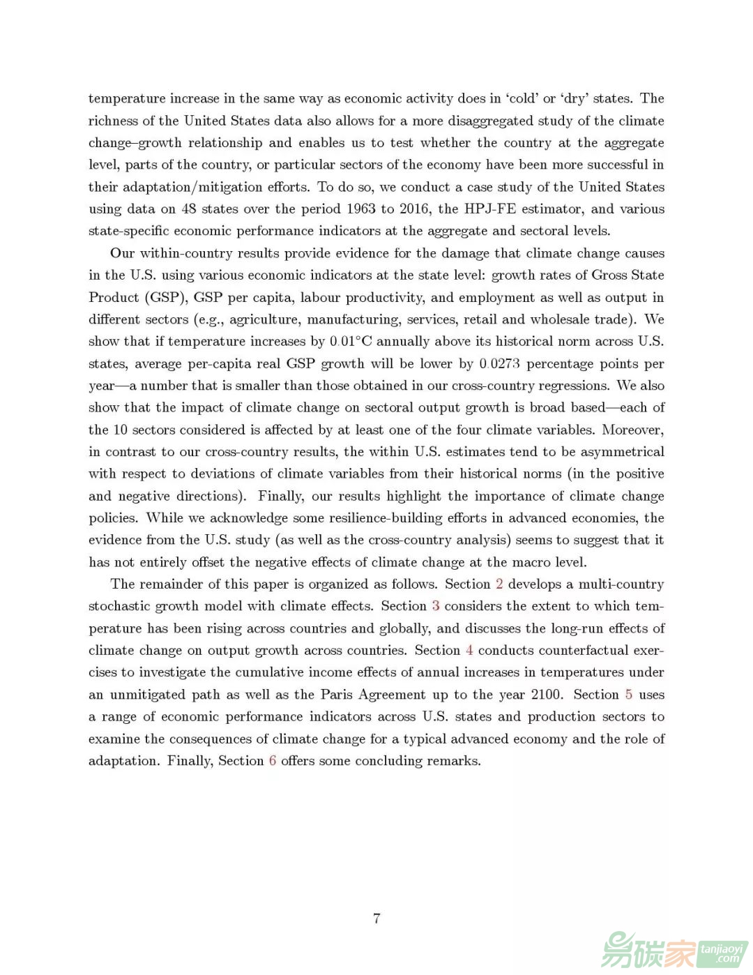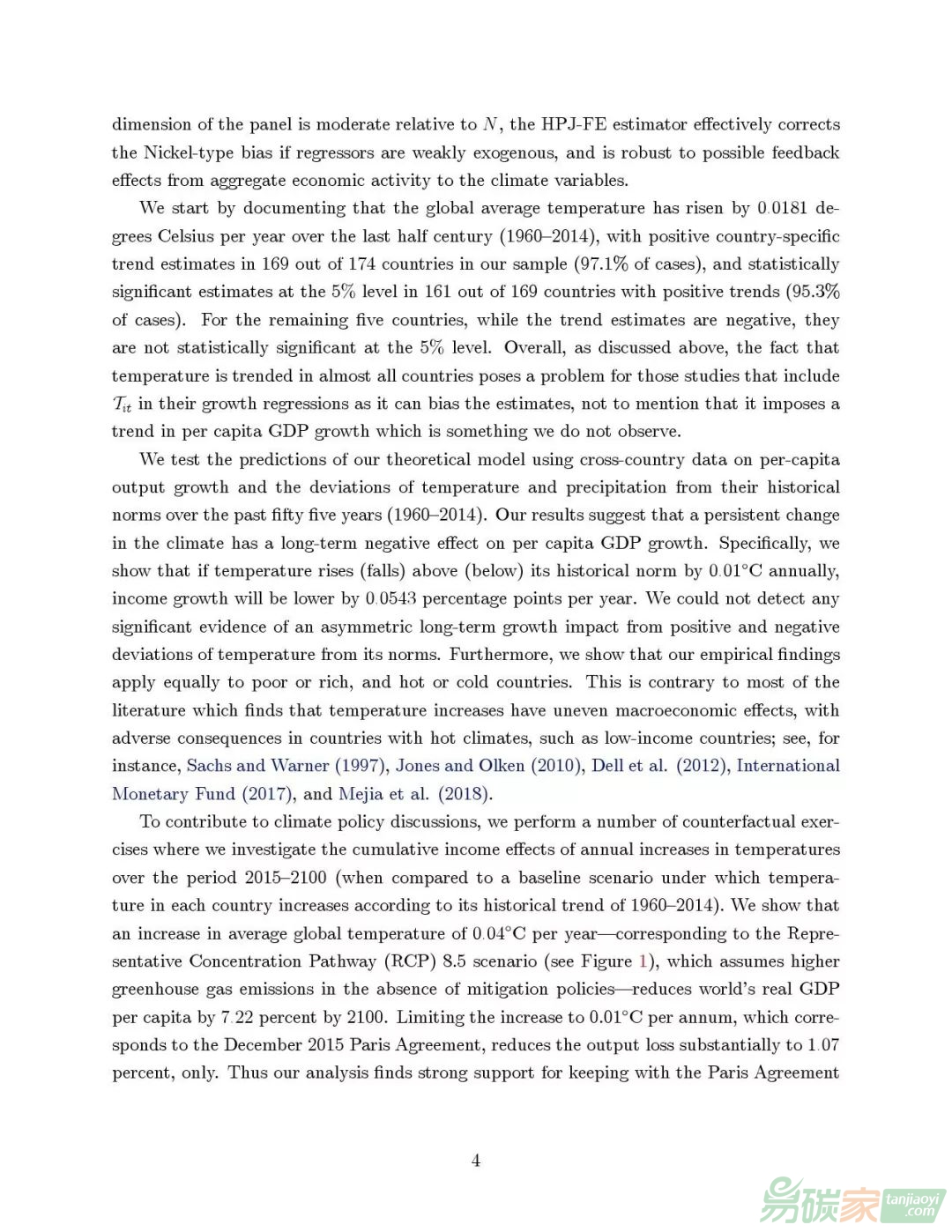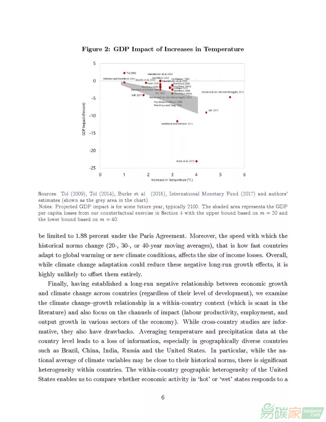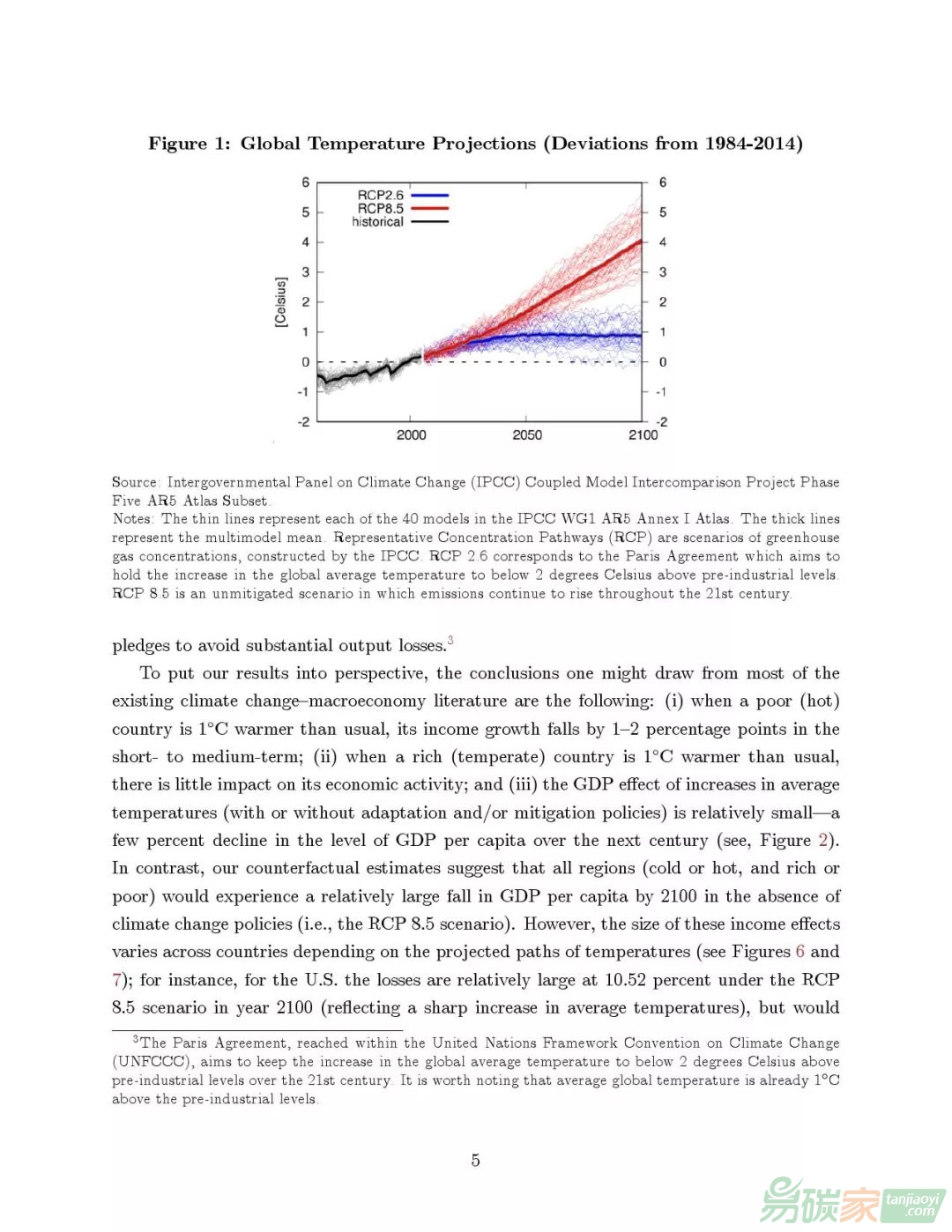 報告稱,在沒有適宜政策的情況下,按目前趨勢發(fā)展,全球平均氣溫每年將持續(xù)上升0.04℃,到2100年,全球人均實際GDP將因此減少7.22%;而如若各國都能遵守《巴黎協(xié)定》,將全球平均氣溫上升幅度限制在每年0.01℃范圍內(nèi),到2100年,全球人均實際GDP遭受的損失將大幅減少至1.07%。