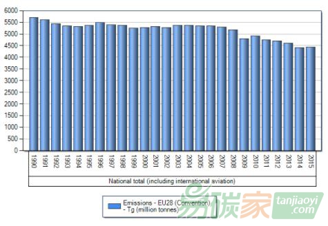 (2)盡管自2007年以來,2015年歐盟的經濟達到了最強勁的年度增長2.2%,但2015年歐盟溫室氣體排放總量僅比2014年輕微增長了0.5%。1990-2015年,歐盟溫室氣體排放總量減少了22.1%,已超過到2020年
