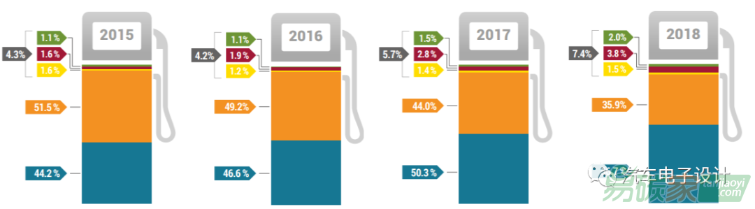 我們可以看到在2015年的達(dá)標(biāo)下,柴油車也達(dá)到了一個階段性的頂峰。這個拐點是排放門事件深遠(yuǎn)的影響,基本把這條路線打廢了。