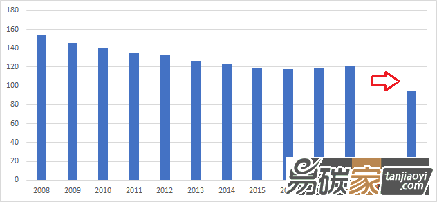 1998年歐盟第一次提出碳排放目標(biāo),計劃從1998年186g/km CO2降到2008年的140g/km CO2,2012年降至120g/km CO2。實際的情況,汽車企業(yè)當(dāng)時還沒意識到這事真的重要,執(zhí)行層面不太好,2008年歐洲乘用車CO2排放量153.5g/km CO2。