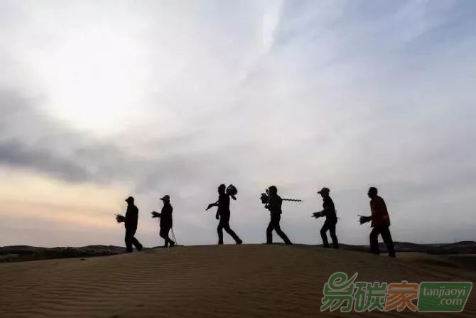 北京只有800公里,被喻為“懸在首都頭上的一壺沙”。這里曾是“死亡之?!?,植被無法存活、飛鳥無法穿越,沙漠里也沒有路,汽車進不去的地方,就要人扛著樹苗,帶上水和鐵鍬步行進入。